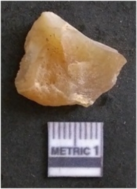 | Description / विवरण | The chalcedony flake is pale in colour and translucent in appearance. The piece has s harp flaked ends and a bulbous end due to flaking. The flake has a crypto-crystalline silica matrix. |