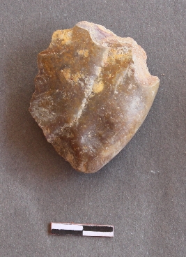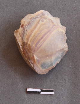 | Description / विवरण | It is a banded chert fragment, with a striking platform, cortex on one end; there are many flake scars with ripples on it. |
