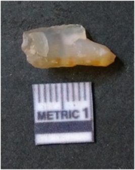 | Description / विवरण | It is chalcedony flake, translucent in appearance. The piece shows sharp pointed ends and flake scars on the surface as a result of flaking. The piece shows a bulb of percussion. |
