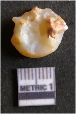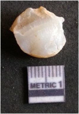 | Description / विवरण | It is chalcedony flake, translucent in appearance. The piece shows sharp pointed ends and flake scars on the surface as a result of flaking. The piece shows a bulb of percussion. |