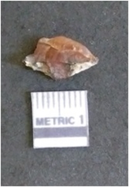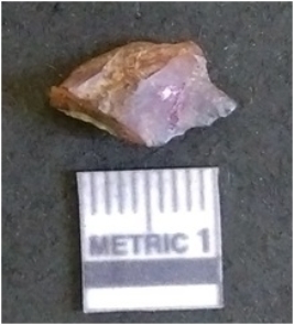 | Description / विवरण | The carnelian flake is red in colour, with angular flaked edges and a bulbous end. The piece has sharp pointed end and a crypto-crystalline matrix. The piece is reddish in colour; with silica base. |