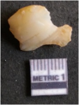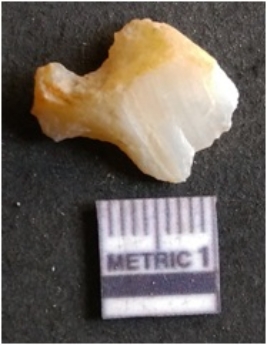 | Description / विवरण | It is chalcedony flake, translucent in appearance. The piece shows sharp pointed ends and flake scars on the surface as a result of flaking. The piece shows a bulb of percussion. |