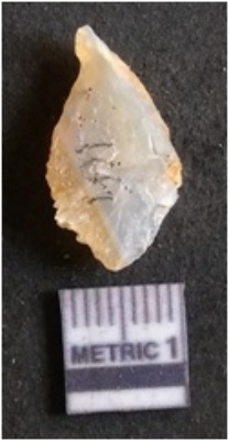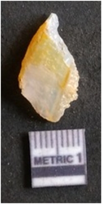 | Description / विवरण | It is chalcedony flake, translucent in appearance. The piece shows sharp pointed ends and flake scars on the surface as a result of flaking. The piece shows a bulb of percussion. |
