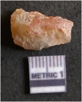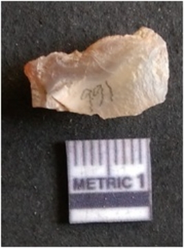 | Description / विवरण | It is chalcedony flake, translucent in appearance. The piece shows sharp pointed ends and flake scars on the surface as a result of flaking. The piece shows a bulb of percussion. |