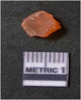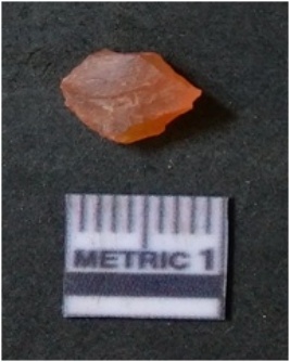 | Description / विवरण | It is carnelian flake red in color, with sharp flakes edges and a small bulb of percussion owing to knapping activity. The piece has sharp flaked edges and a crypto-crystalline matrix. |