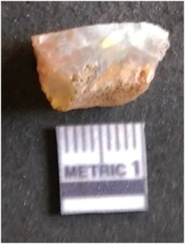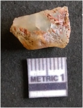 | Description / विवरण | The quartz flake has sharp flaked edges and pointed ends as a result of flaking. The piece is semi-transparent in nature with irregular fracture pattern. The piece is roughly triangular in shape and has a prominent bulb of percussion. |