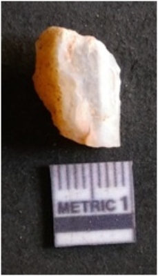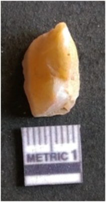 | Description / विवरण | It is chalcedony flake, translucent in appearance. The piece shows sharp pointed ends and flake scars on the surface as a result of flaking. The piece shows a bulb of percussion. |