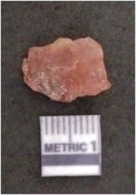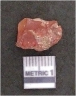 | Description / विवरण | The carnelian flake is red in colour, with angular flaked edges and a bulbous end. The piece has sharp pointed end and a crypto-crystalline matrix. The piece is reddish in colour; with silica base. |