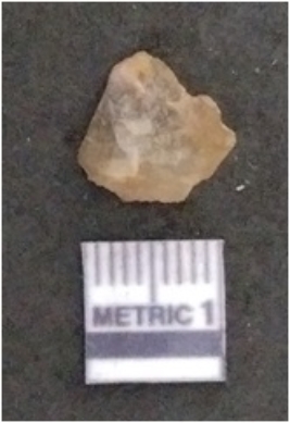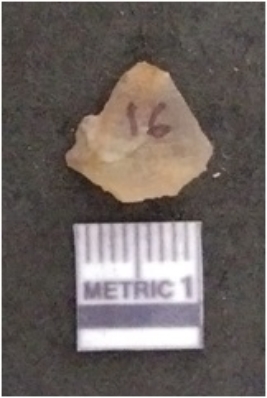 | Description / विवरण | The flake is of smoky quartz variety, grayish in color and translucent in appearance. The flake has irregular fracture pattern and sharp flaked edges as a result of lithic knapping activity. The piece is pale, with surface flake scars and a bulbous end. |