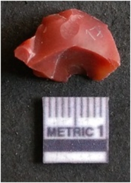 | Description / विवरण | The jasper flake is small, roughly rounded and flat. It has flake scars on the surface and sharp edges. The piece is crypto crystalline in nature, and has a negative bulb of percussion. |