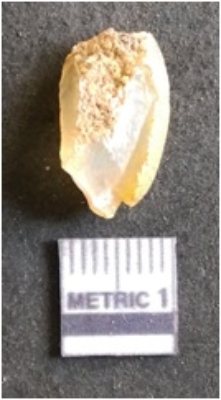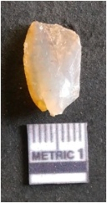 | Description / विवरण | It is chalcedony flake, translucent in appearance. The piece shows sharp pointed ends and flake scars on the surface as a result of flaking. The piece shows a bulb of percussion. |