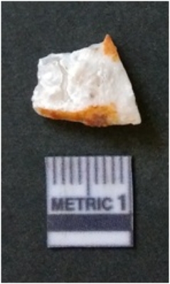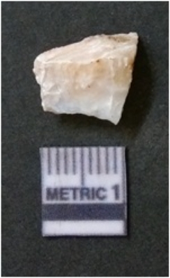 | Description / विवरण | The milky quartz flake has irregular fracture pattern and sharp flaked edges as a result of lithic knapping activity. The piece is pale, with surfacial flake scars and a bulbous end. The flake is white in color. |
