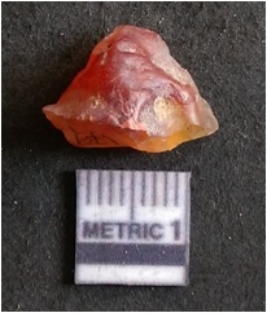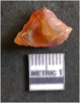 | Description / विवरण | It is carnelian flake red in color, with sharp flakes edges and a small bulb of percussion owing to knapping activity. The piece has sharp flaked edges and a crypto-crystalline matrix. |