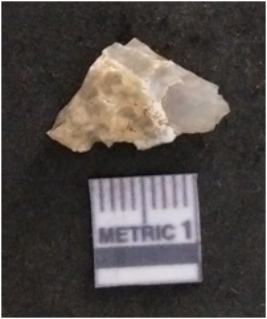 | Description / विवरण | The quartz flake has irregular fracture pattern and sharp flaked edges as a result of lithic knapping activity. The piece is pale, with surface flake scars and a bulbous end. |