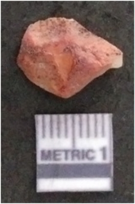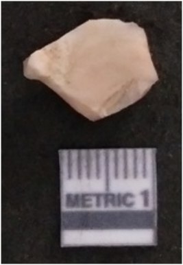 | Description / विवरण | The quartz flake has irregular fracture pattern and sharp flaked edges as a result of lithic knapping activity. The piece is pale, with surface flake scars and a bulbous end. |