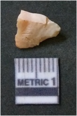 | Description / विवरण | The flake has irregular fracture pattern and sharp flaked edges as a result of lithic knapping activity. The piece is pale, with surfacial flake scars and a bulbous end. The quartz flake is rosy white in colour. |