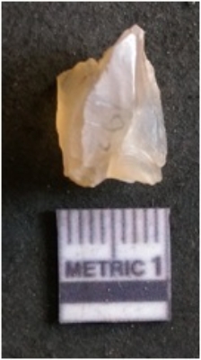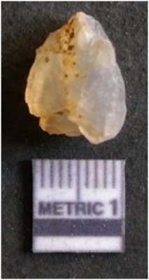 | Description / विवरण | It is chalcedony flake, translucent in appearance. The piece shows sharp pointed ends and flake scars on the surface as a result of flaking. The piece shows a bulb of percussion. |