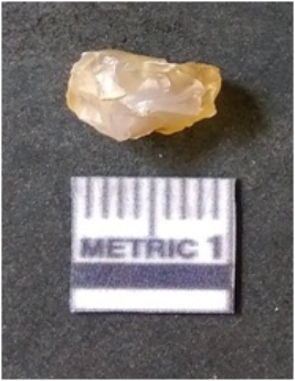 | Description / विवरण | It is chalcedony flake, translucent in appearance. The piece shows sharp pointed ends and flake scars on the surface as a result of flaking. The piece shows a bulb of percussion. |