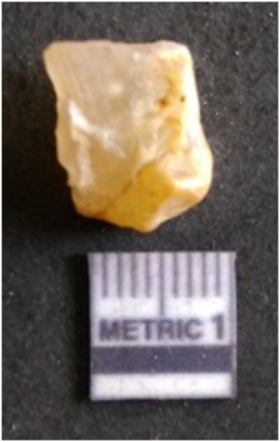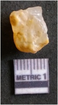 | Description / विवरण | It is chalcedony flake, translucent in appearance. The piece shows sharp pointed ends and flake scars on the surface as a result of flaking. The piece shows a bulb of percussion. |