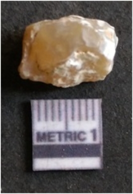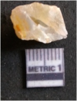 | Description / विवरण | The quartz flake has sharp flaked edges and pointed ends as a result of flaking. The piece is semi-transparent in nature with irregular fracture pattern. The piece is roughly triangular in shape and has a prominent bulb of percussion. |