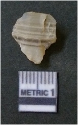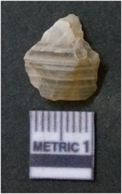| Description / विवरण | The banded agate piece is crystalline in nature, with a smooth fracture pattern and visible bands on the flaked sides. The piece is pale in color and has sharp flaked ends. |