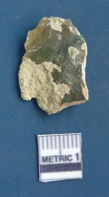 | Description / विवरण | It is a blade fragment. The sides are sharp and retouched. It is greenish in colour. The striking platform and the bulb of percussion is clearly visible. The flake scars are clearly seen on the dorsal surface while the ventral surface is plain. The soil incrustations are clearly seen on the surface. |