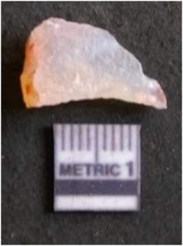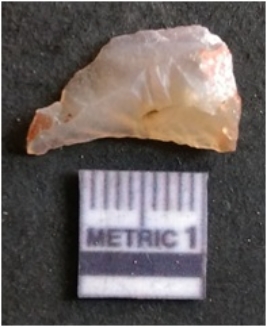 | Description / विवरण | The chalcedony flake is small, with surfacial flake scars and sharp flake ends. The piece is translucent in appearance with a prominent bulb of percussion. |