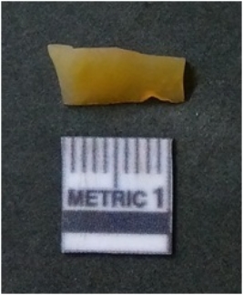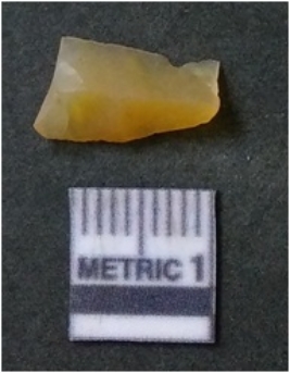 | Description / विवरण | It is chalcedony flake, translucent in appearance. The piece shows sharp pointed ends and flake scars on the surface as a result of flaking. The piece shows a bulb of percussion. |