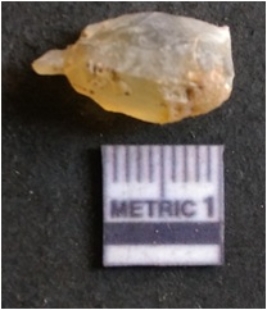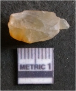 | Description / विवरण | The chalcedony flake is small, with surfacial flake scars and sharp flake ends. The piece is translucent in appearance with a prominent bulb of percussion. |
