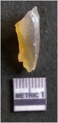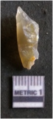 | Description / विवरण | The chalcedony flake is small, with surfacial flake scars and sharp flake ends. The piece is translucent in appearance with a prominent bulb of percussion. |