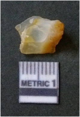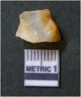 | Description / विवरण | It is chalcedony flake, translucent in appearance. The piece shows sharp pointed ends and flake scars on the surface as a result of flaking. The piece shows a bulb of percussion. |