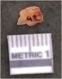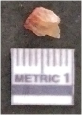 | Description / विवरण | The chalcedony flake is pale in color and translucent in appearance. The piece has s harp flaked ends and a bulbous end due to flaking. The flake has a crypto-crystalline silica matrix. |