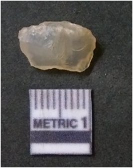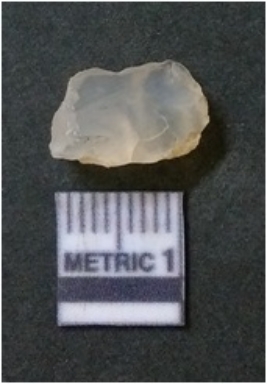 | Description / विवरण | The quartz flake has sharp flaked edges and pointed ends as a result of flaking. The piece is semi-transparent in nature with irregular fracture pattern. The piece is roughly triangular in shape and has a prominent bulb of percussion. |
