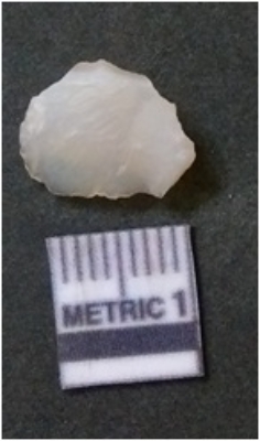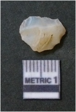 | Description / विवरण | The quartz flake has sharp flaked edges and pointed ends as a result of flaking. The piece is semi-transparent in nature with irregular fracture pattern. The piece is roughly triangular in shape and has a prominent bulb of percussion. |