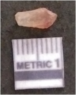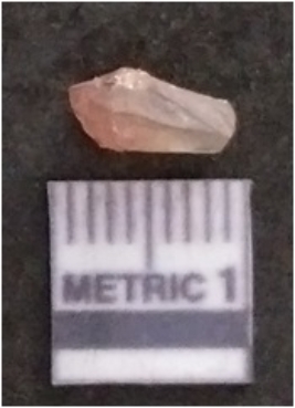 | Description / विवरण | The chalcedony flake is pale in color and translucent in appearance. The piece has s harp flaked ends and a bulbous end due to flaking. The flake has a crypto-crystalline silica matrix. |