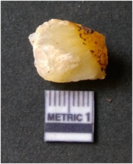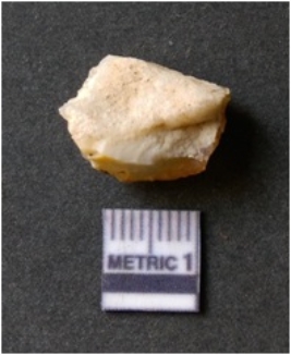 | Description / विवरण | It is chalcedony flake, translucent in appearance. The piece shows sharp pointed ends and flake scars on the surface as a result of flaking. The piece shows a bulb of percussion. |