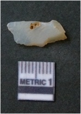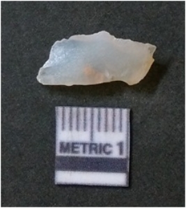 | Description / विवरण | The quartz flake has sharp flaked edges and pointed ends as a result of flaking. The piece is semi-transparent in nature with irregular fracture pattern. The piece is roughly triangular in shape and has a prominent bulb of percussion. |