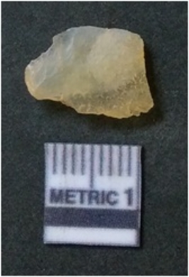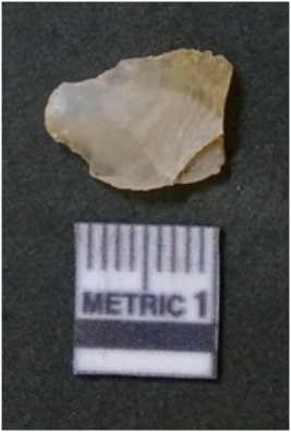 | Description / विवरण | The quartz flake has sharp flaked edges and pointed ends as a result of flaking. The piece is semi-transparent in nature with irregular fracture pattern. The piece is roughly triangular in shape and has a prominent bulb of percussion. |