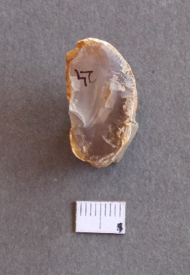 | Description / विवरण | It is a chalcedony fragment, with a bulb of percussion on the ventral side. Cortex on one end. |