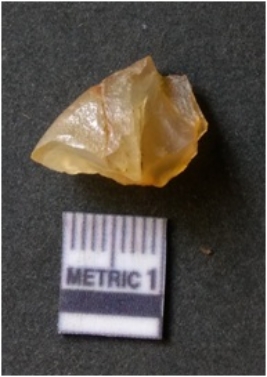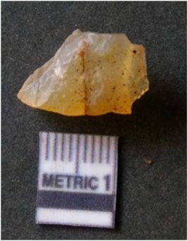 | Description / विवरण | It is chalcedony flake, translucent in appearance. The piece shows sharp pointed ends and flake scars on the surface as a result of flaking. The piece shows a bulb of percussion. |
