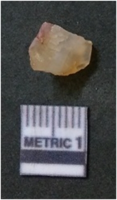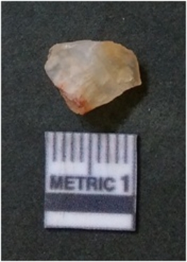 | Description / विवरण | The quartz flake has sharp flaked edges and pointed ends as a result of flaking. The piece is semi-transparent in nature with irregular fracture pattern. The piece is roughly triangular in shape and has a prominent bulb of percussion. |