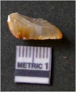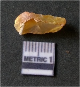 | Description / विवरण | It is chalcedony flake, translucent in appearance. The piece shows sharp pointed ends and flake scars on the surface as a result of flaking. The piece shows a bulb of percussion. |