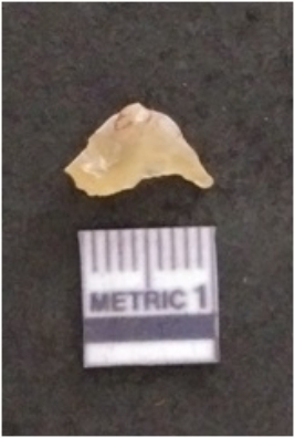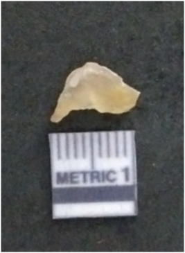 | Description / विवरण | The chalcedony flake is pale in color and translucent in appearance. The piece has s harp flaked ends and a bulbous end due to flaking. The flake has a crypto-crystalline silica matrix. |