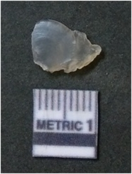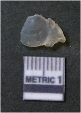 | Description / विवरण | The quartz flake has sharp flaked edges and pointed ends as a result of flaking. The piece is semi-transparent in nature with irregular fracture pattern. The piece is roughly triangular in shape and has a prominent bulb of percussion. |