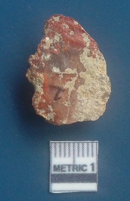 | Description / विवरण | It is a flake. The sides are sharp and retouched. It is reddish in colour. The striking platform and the bulb of percussion is clearly visible. The flake scars are clearly seen on the dorsal surface while the ventral surface is plain. |