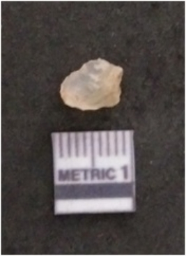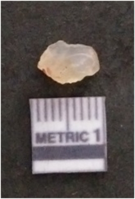 | Description / विवरण | The chalcedony flake is pale in color and translucent in appearance. The piece has s harp flaked ends and a bulbous end due to flaking. The flake has a crypto-crystalline silica matrix. |