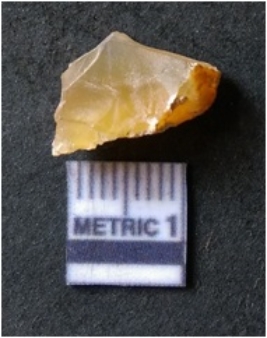 | Description / विवरण | It is chalcedony flake, translucent in appearance. The piece shows sharp pointed ends and flake scars on the surface as a result of flaking. The piece shows a bulb of percussion. |