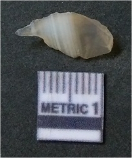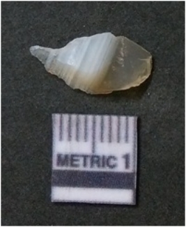 | Description / विवरण | The agate piece is translucent in appurtenance, with angular flaked edges and a bulb of percussion. The piece shows flake scars on the surface. |