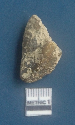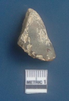 | Description / विवरण | It is a flake. The sides are sharp and retouched. It is brownish in colour. The striking platform and the bulb of percussion is clearly visible. The flake scars are clearly seen on the dorsal surface while the ventral surface is plain. The soil incrustations are clearly visible on the surface. |