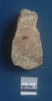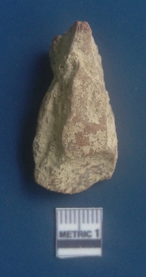 | Description / विवरण | It is a flake. The sides are sharp and retouched. It is light reddish in colour. The striking platform and the bulb of percussion is clearly visible. The flake scars are clearly seen on the dorsal surface while the ventral surface is plain. The soil incrustations are clearly visible on the surface. |